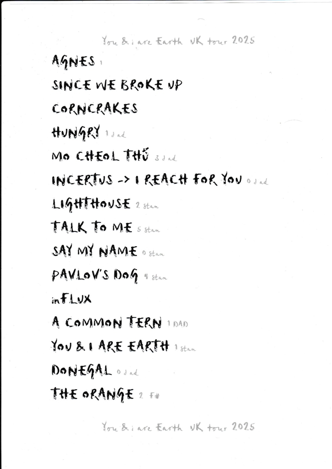 Gli ultimi due brani di “You & I Are Earth” sono la title track e Donegal. La chiusura è affidata a Orange, durante cui Anna esorta il pubblico a toccarsi affettuosamente, “solo se vi conoscete, ovviamente”. Dopo aver lasciato risuonare l’ultimo accordo, il quartetto si raduna per un abbraccio collettivo a luci accese, ringrazia, saluta e lascia il palco.
